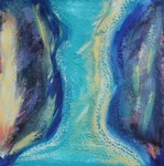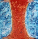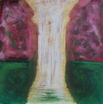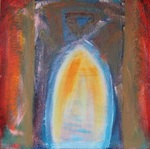 2013Het rood, oranje en geel, staat voor het innerlijk verteerd worden. Het blauw in de poort staat voor het koude, onaangename van de confrontatie met jezelf die er aan vooraf gaat om met jezelf in het reine te kunnen komen. En de poort, waarvan het binnengaan symbool staat voor in het reine komen met jezelf.